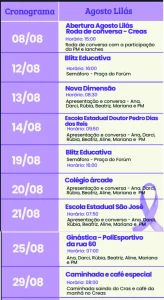 A programação do Agosto Lilás inclui uma série de atividades, como palestras e ações comunitárias, que acontecerão ao longo do mês. O objetivo é sensibilizar a população e oferecer informações sobre os serviços de apoio disponíveis para as mulheres em situação de vulnerabilidade. Amanhã acontece Blitz Educativa na Praça do Fórum a partir das 16h.