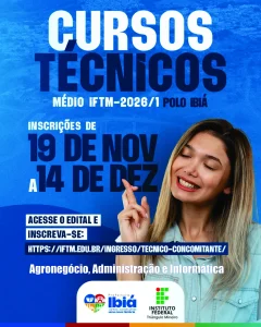 O Instituto Federal do Triângulo Mineiro (IFTM) abriu hoje as inscrições para o Processo Seletivo 2026/1 dos cursos técnicos concomitantes ao Ensino Médio. A oportunidade é destinada a estudantes que desejam iniciar uma formação técnica gratuita, com previsão de início das aulas para fevereiro de 2026. As inscrições seguem até 14