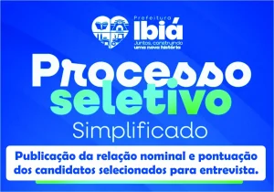 PROCESSO SELETIVO DE TÍTULOS E HABILITAÇÃO PARA CONTRATAÇÃO DE PESSOAL PARA PREENCHIMENTO DE VAGAS NO CARGO PÚBLICO DE QUADRO DE PESSOAL DO PODER EXECUTIVO NA PREFEITURA MUNICIPAL DE IBIÁ MG. CLASSIFICAÇÃO ENTREVISTAS Todas as entrevistas serão realizadas na Escola Municipal José Dias dos Reis – Rua Clóves Miguel da