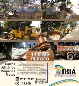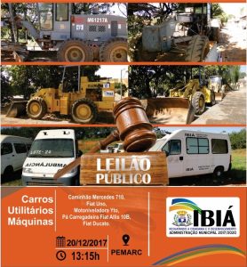 A Prefeitura de Ibiá comunica aos interessados que irá realizar no próximo dia 20 de dezembro, a partir das 13 h, na Pemarc, novo Leilão Público, para venda de bens móveis: 03 veículos automotores, 02 máquinas e sucatas, na modalidade maior lance. Os