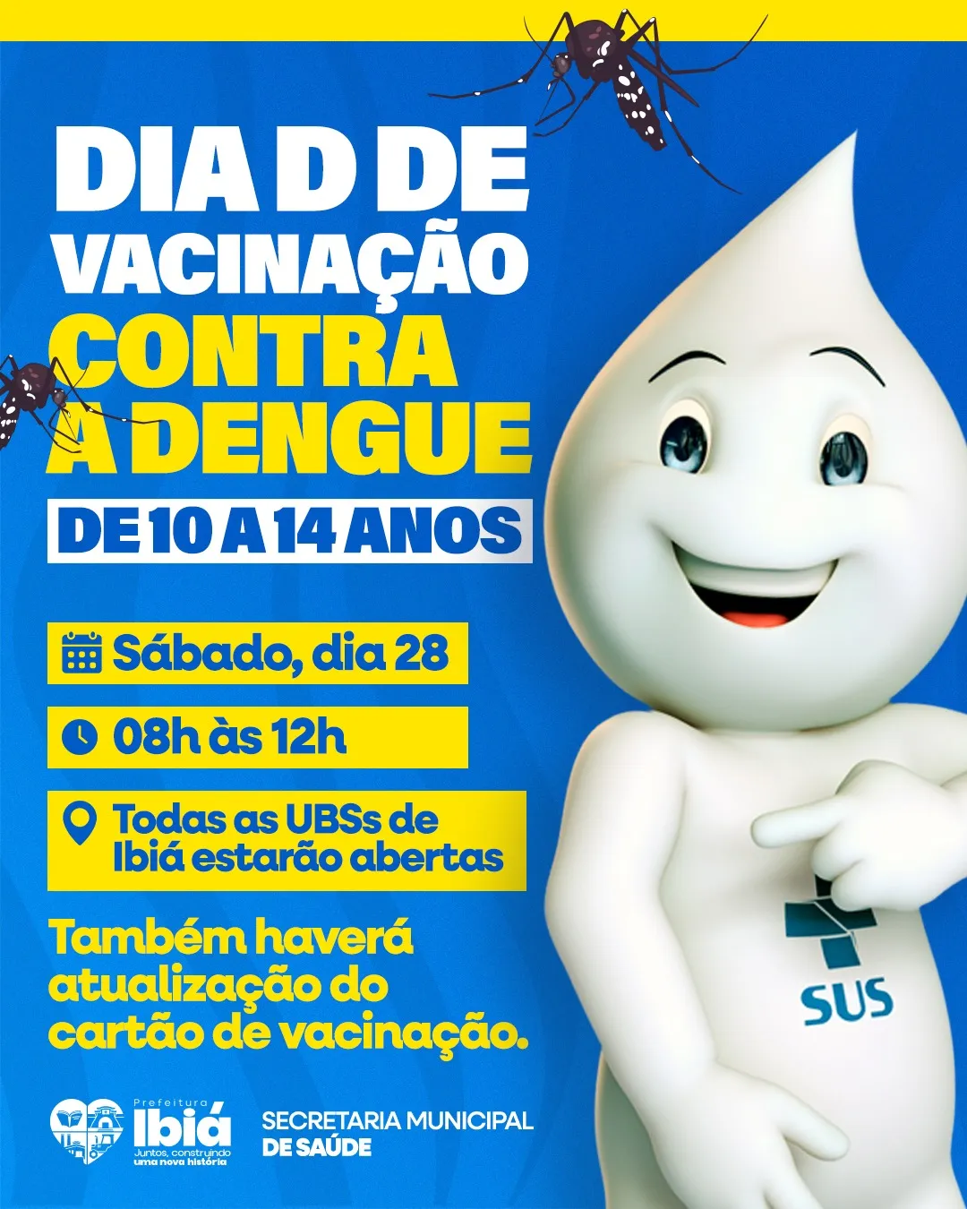 A Prefeitura de Ibiá realiza amanhã o Dia D de Combate à Dengue, com ações de prevenção e incentivo à vacinação. A programação inclui vacinação contra a dengue, destinada a crianças de 10 a 14 anos, e também a disponibilização de todas as demais vacinas para atualização do cartão, ampliando a proteção da população contra diversas doenças.