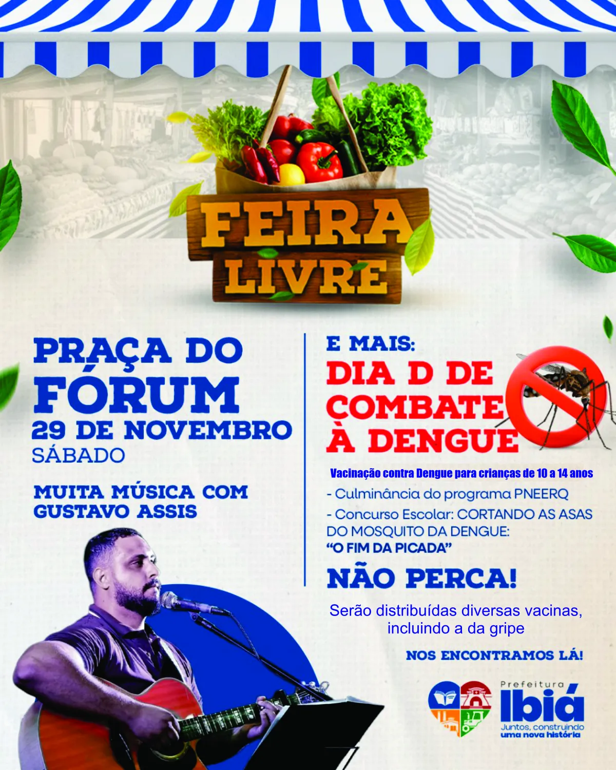 A Secretaria Municipal de Cultura e Turismo realiza neste sábado, das 9h às 12h30, uma Feira Livre Especial repleta de atividades para toda a comunidade ibiaense. O evento reunirá, em um só espaço, ações de educação, cultura, saúde, proteção animal e sustentabilidade, reforçando o compromisso do município com a integração e o bem-estar da população.