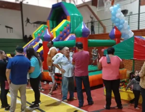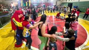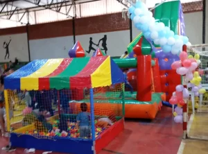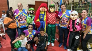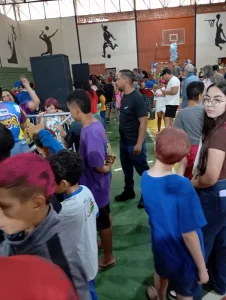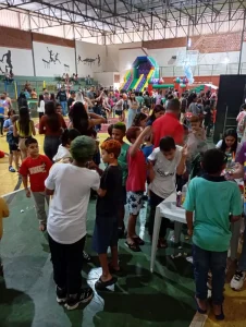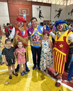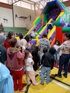 Devido à chuva, o evento precisou ser transferido para o Poliesportivo da Rua 60, mas o público compareceu em peso. O local foi tomado por brinquedos, pipocas, algodão-doce, muitas brincadeiras, apresentação dos palhaços Pimpão e Fumaça, garantindo um clima de festa e encantamento.