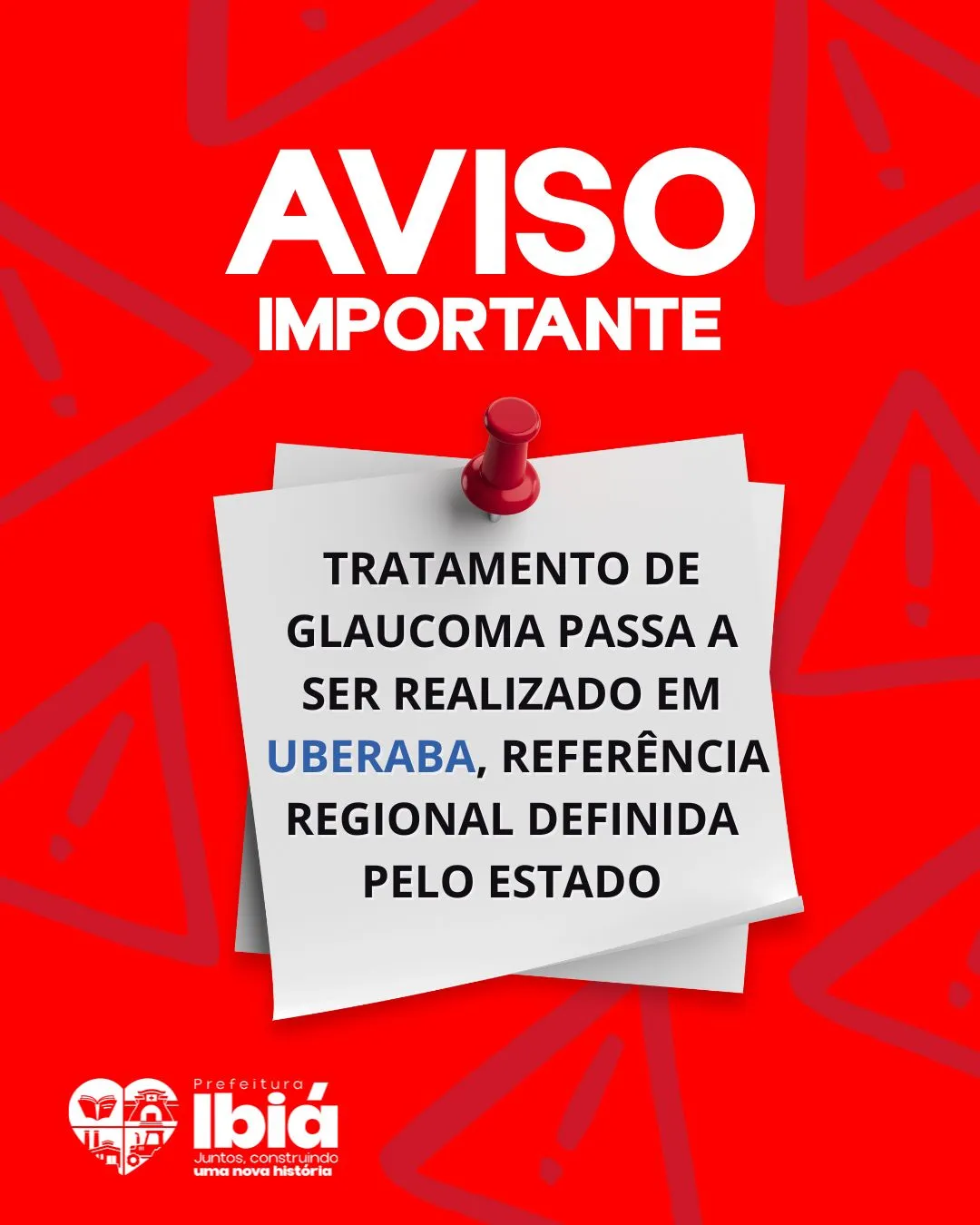 A Prefeitura de Ibiá, por meio da Secretaria Municipal de Saúde, esclarece à população que os tratamentos do Projeto Glaucoma, anteriormente realizados em Patrocínio, passarão a ser feitos em Uberaba, conforme nova pactuação estabelecida pelo Governo do Estado de Minas Gerais.